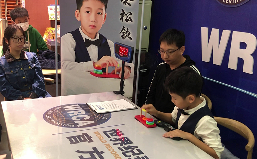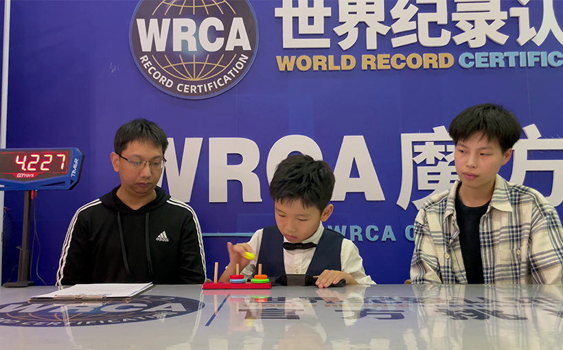 Cai Songqin (Xiamen, China) successfully solved a 5 level Tower of Hanoi with one hand in 11.141 seconds in Xiamen, China, on 4 December 2022. Verified by the WRCA, Cai Songqin successfully broke the world record for the "Fastest time to solve a 5 level Tower of Hanoi with one hand".