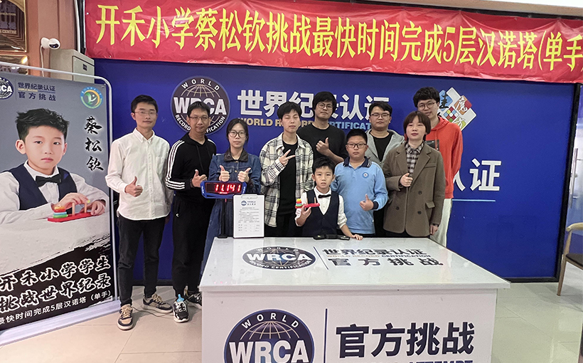 来自中国厦门市的蔡松钦于2022年12月4日在厦门市以单手成功完成5层汉诺塔,用时11.141秒。2022年12月4日,经世界纪录认证(WRCA)官方审核,蔡松钦成功打破“最快时间完成5层汉诺塔(单手)”世界纪录。