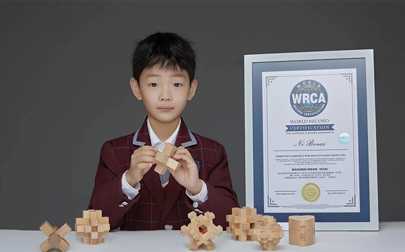 Ni Borui (Huai'an, China) successfully assembled a three-piece Burr puzzle (Haohan lock) in 1.406 seconds in Huai'an City, China, on 20 September 2023. Verified by the WRCA, Ni Borui has set the world record for the "Fastest time to assemble a three-piece Burr puzzle (Haohan lock)".