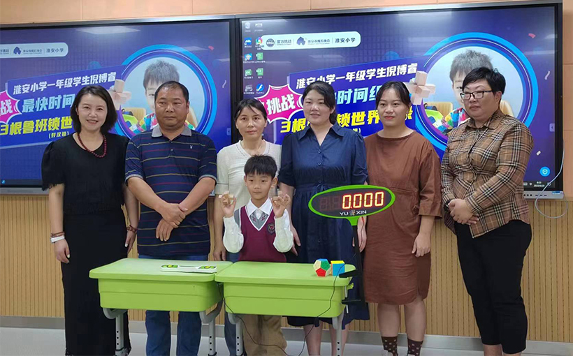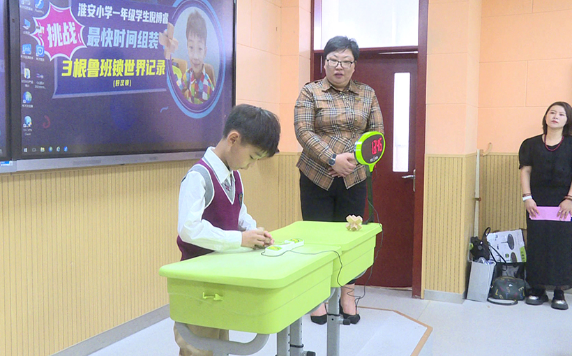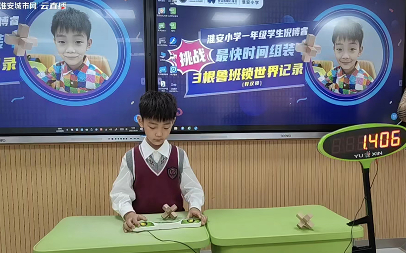 倪博睿本次挑战的项目的是我们中国的传统文化鲁班锁中的好汉锁。鲁班锁亦称孔明锁,种类多样,千奇百怪,是一款益智类的玩具。在张艳飞校长检验挑战道具和计时器后,倪博睿正式发起最快时间组装3根鲁班锁世界记录挑战,仅仅用1.406秒就将3根鲁班锁还原至完整形态,赢得现场师生的阵阵掌声。