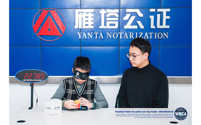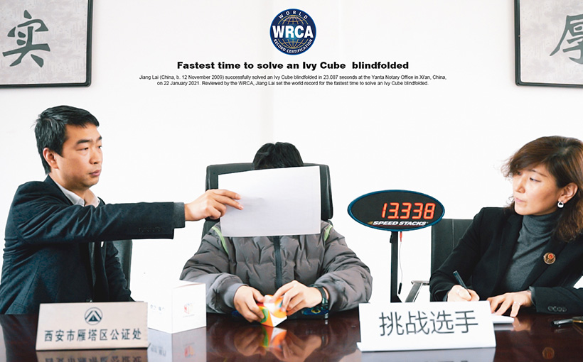Jiang Lai (China, b. 12 November 2009) successfully solved an Ivy Cube blindfolded in 23.087 seconds at the Yanta Notary Office in Xi'an, China, on 22 January 2021. Reviewed by the WRCA, Jiang Lai set the world record for the fastest time to solve an Ivy Cube blindfolded.