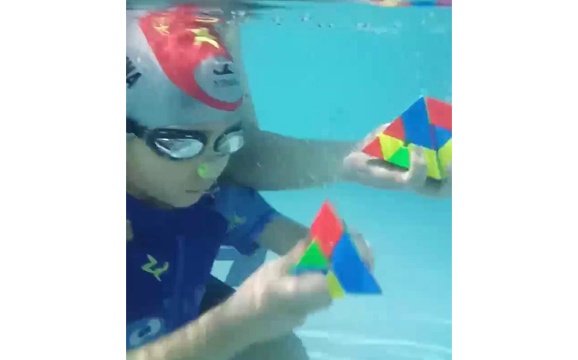 学习魔方几个月,汪凯乐最喜欢的就是金字塔魔方,每天几百遍的练习量让汪凯乐的还原速度有了很大的提高。为了挑战世界纪录,勇敢的汪凯乐小朋友,一遍又一遍的在泳池里练习着憋气,为了能尽快的适应水下还原魔方,更是成百上千次的练习。
