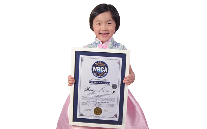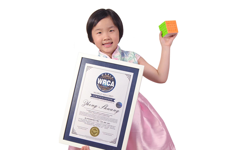 Zheng Shuang (China, b. 16 January 2017), under the inspiration of Zhao Junwei (China) and training by Tan Haijun (China), successfully solved a 3x3x3 Rubik's Cube, a 4x4x4 Rubik's Cube and a 5x5x5 Rubik's Cube consecutively in 10 minutes 09.86 seconds at the HOTCUBE Training School in Guangzhou, China, on 16 February 2022. Verified by the WRCA, Zheng Shuang has set the world record for the youngest person ever to solve 3 rotating puzzle cubes (3x3x3, 4x4x4 and 5x5x5) consecutively.