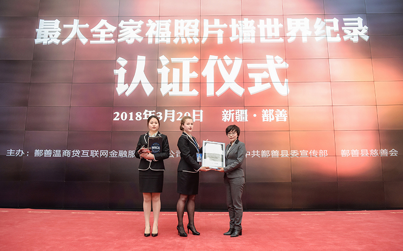 Shanshan Wenshang Loan Internet Financial Service Co., Ltd. launched a challenge of "The Biggest Photo Wall of the Whole Family" in Shanshan County of the Xinjiang Uyghur Autonomous Region. On 20th March 2018, the World Record Certification Agents performed on-site authentication and verified the challenge created a new world record of "The Biggest Photo Wall of the Whole Family".(2018年3月20日)