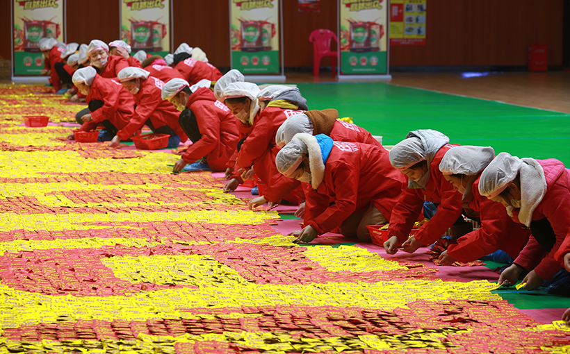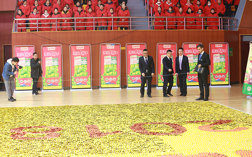 In the official world record challenge initiated by Hunan Wuzi Co., Ltd., the largest slogan pattern made of betel nut (packaging) was created and measured 420 m2 (28 m long and 15 m wide). The World Record Certification Agents performed on-site authentication and verified the challenge with a new world record of the biggest betel nut slogan jigsaw puzzle.