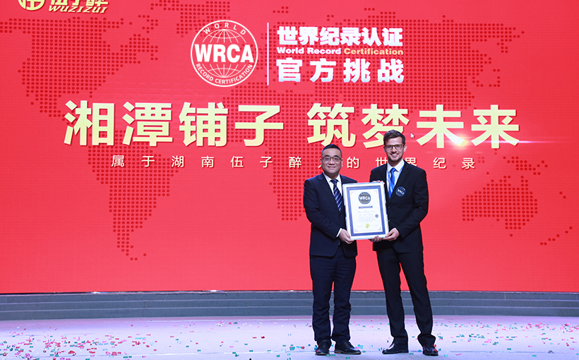 2018年12月29日,“湘潭铺子·枸杞槟榔周年庆暨成果发布会”在长沙瑞吉大酒店内隆重召开,发布会中世界纪录认证机构的代表亚历山大先生登台,向湖南伍子醉食品有限公司董事长宾海龙颁发了世界纪录认证证书,以庆贺湘潭铺子枸杞槟榔成功通过两项世界纪录认证。