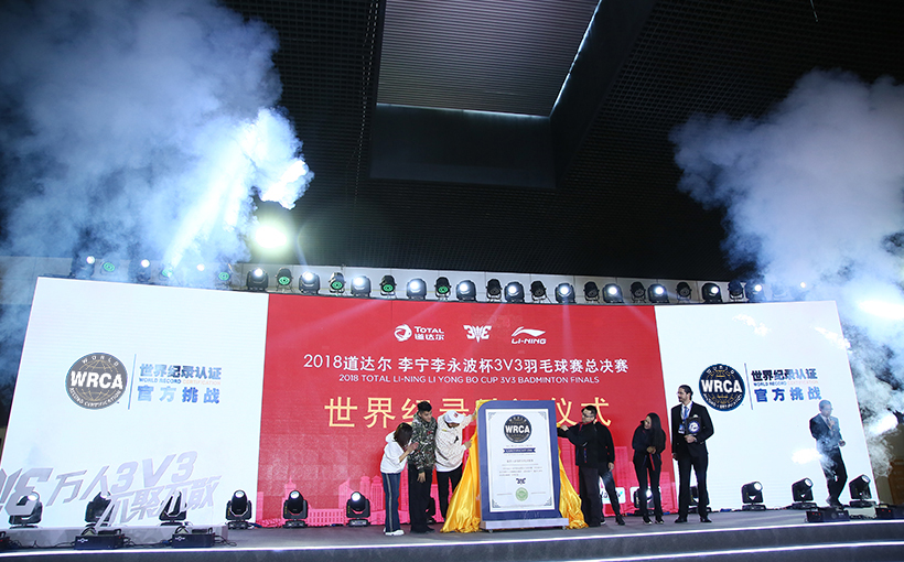 Sponsored by Li Ning (China) Sports Goods Co., Ltd. and Total Oil (China) Co., Ltd., the 2018 Total Li-Ning Li Yongbo Cup 3V3 Badminton Tournament was held from May 2018 to November 2018. 32,417 participants took part in the tournament. The tournament set the world record for The World's Most-attended Badminton Tournament.