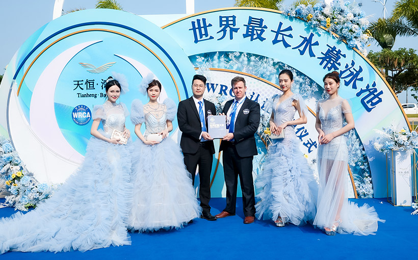 由天大集团旗下中国珠海天恒房地产有限公司开发建设的“天恒·湾景”项目水幕泳池,主体长度为108米,泳池底部距地面高度为5米。2021年3月20日,经世界纪录认证(WRCA)官方审核,被认定为“世界最长的水幕泳池”。