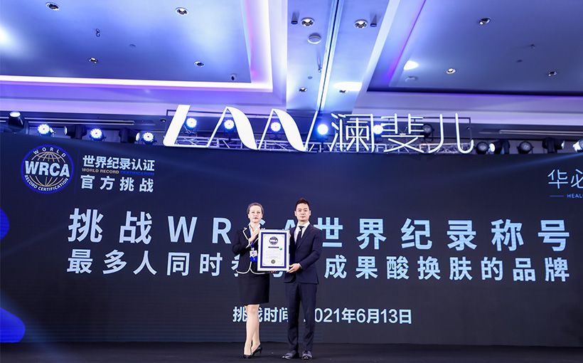 由澜锡(浙江)生物科技有限公司发起的世界纪录认证官方挑战中,现场共260人同时参与完成果酸换肤挑战。经世界纪录认证(WRCA)官方审核,该公司成功创造“最多人同时参与完成果酸换肤的品牌”世界纪录。