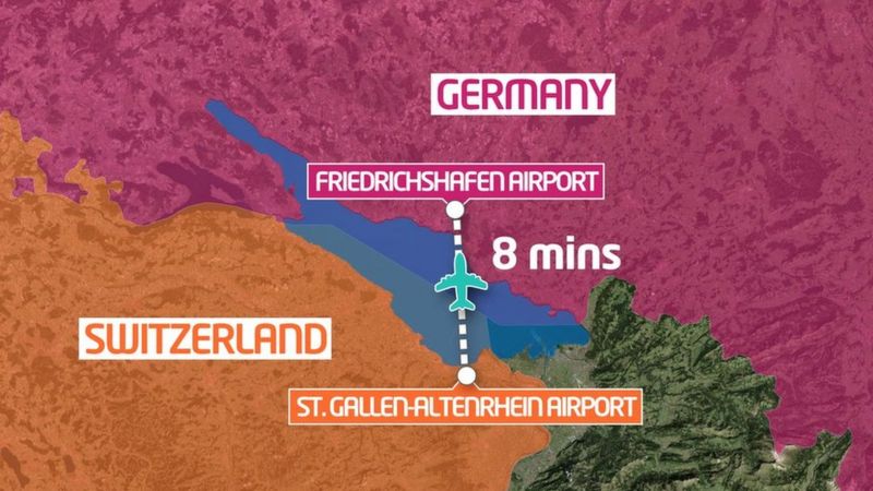 An airline has launched what it claims is the world's shortest international flight, taking just eight minutes. The new route connects St Gallen-Altenrhein in Switzerland to Friedrichshafen in southern Germany. Passengers can book the super short journey between the two countries for around 40 euros (?35).
