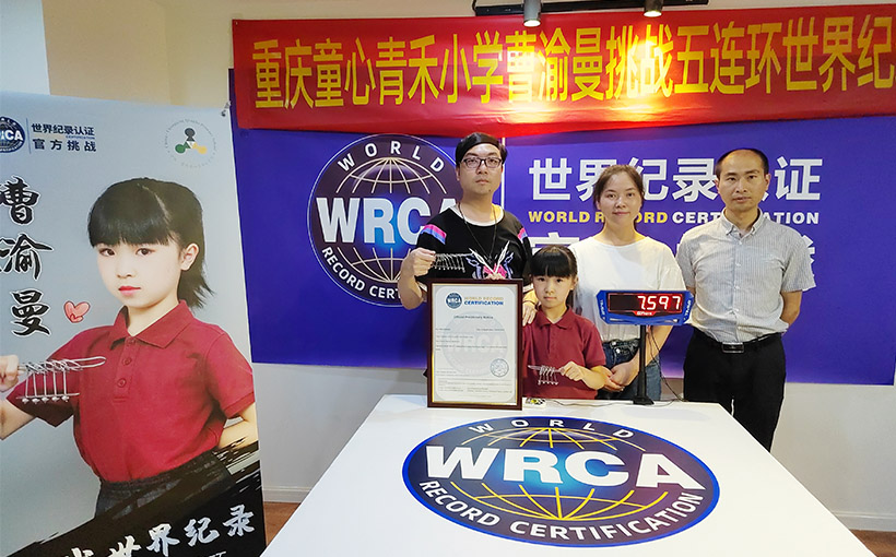 来自中国重庆市的曹渝曼于2022年6月5日在重庆市以7.597秒成功分解五连环。经世界纪录认证(WRCA)官方审核,曹渝曼成功创造“最快时间解五连环”世界纪录。