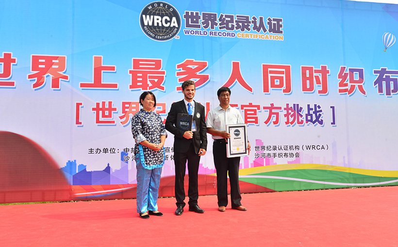 801 participants weaved at the same time, exceeding the previous record at the event "Four Pieces of Cloth at Shahe" organized by the Bureau of Culture, Radio, Television and Press and Sports of Shahe City, Hebei Province, China. After being certified by the World Record Certification Agency on site officers, the event was confirmed to be the world record for Most People Weaving Simultaneously.