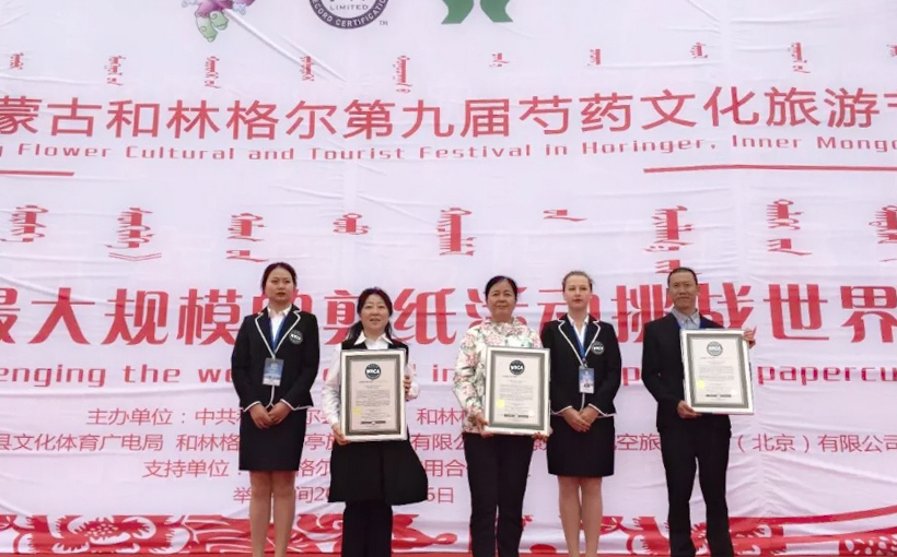 Helingeer County’s Government in cooperation with China Film Colorful Aviation Travel Culture (Beijing) Co. Ltd.、China Film Colorful legend Culture Media (Beijing) Co., Ltd.and Helingeer County Rural Credit Cooperatives organized the world record challenge of the Largest paper cutting event. The challenge was held on 26th May 2018 Nanshan tourist scenic spot, Helingeer County, Inner Mongolia Autonomous Region, China. The World Record Certification Agency authenticated the event and verified a new world record of the Largest paper cutting event.