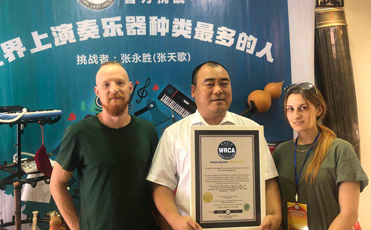 Mr. Zhang Yongsheng from Anshan city, Liaoning Province, played 51 instruments including piano, cello, trombone, clarinet, erhu, pipa, drums, etc. World Record Certification Agency authenticated that Mr. Zhang Yongsheng created a new world record of "Person playing the most types of instruments in the world".