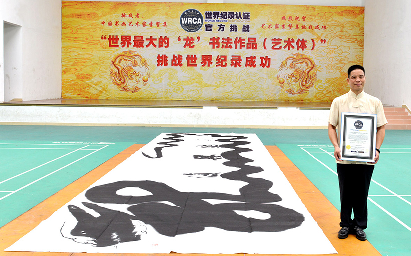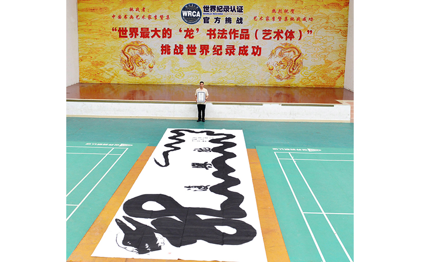 The calligraphy work of "Rejuvenating Dragon" created by Mr. Li Zanji, Chinese painter and calligraphy artist, measures 10 meters in length, 3 meters in width, with a total area of 30 square meters.On 8th June 2018, the World Record Certification Agents authenticated the art piece and verified it to be the world's largest dragon calligraphy (artistic style).