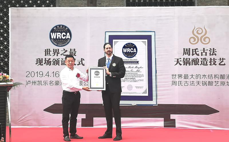 2019年4月16日,泸州凯乐名豪酒业有限公司在政府各部门领导和嘉宾的见证下隆重举行世界纪录认证现场授牌仪式,名豪酒业酿酒车间被认证为“世界最大的木结构酿酒车间”,世界纪录认证官大明Damir First为名豪酒业董事长周德文先生颁发世界纪录认证证书。