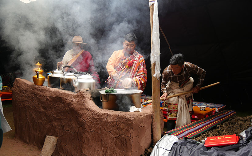 传统的牦牛毡黑帐篷制作技艺富有很深的历史,是藏民族的传统。2015年由苏格带头成立了囊谦苏格黑帐篷生态旅游有限责任公司,组织江尕为首的牧民家庭和周边牧民群众,以牦牛毛为主要材料,经过3年手工制作完成了这顶可容纳700余人的藏式黑帐篷。