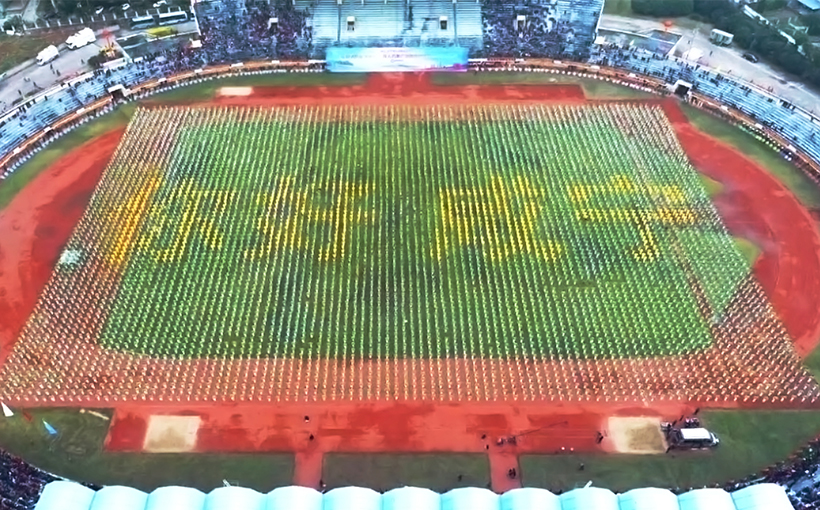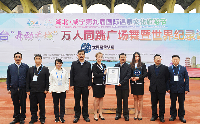 Performed in Xianning city, Hubei province, China, at the Xianning International Spa Tourism Festival, ten thousand people performed a dance "wudong xiangcheng" and formed Chinese characters "你好咸宁"(hello, Xianning). The World Record Agents carried out on site authentication and verified the number of participants reached the requirements for declaring the event the largest square dancing with forming Chinese characters a world record.