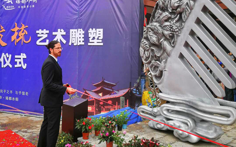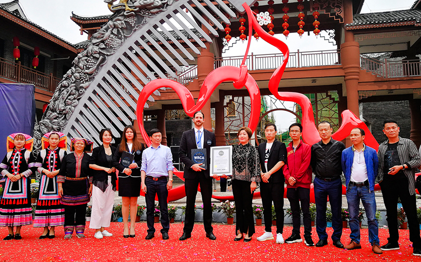The 11.5-meter-long, 6.5-meter-wide, "Jiefa comb" artistic sculpture, organized by Jianghua Aqua Street of Yao's Town Tourism Real Estate Development Co.,Ltd., Hunan Province, China, consists of copper comb and ribbons. The copper comb is cast from brass, 7.05m long, 3.8m high and 0.87m thick. Certified by the World Record Certification Agency on-site, it is recognized as the "Largest sculpture of copper comb".
