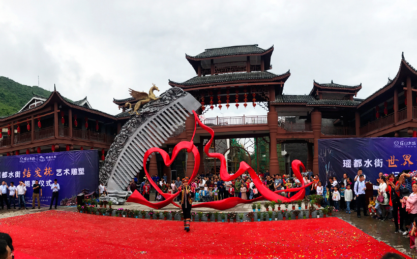 水口瑶都水街项目位于湖南省最大的移民新镇江华县水口镇,占地165亩。该项目是江华县委县政府实施旅游升温战役、打胜移民安置战役的重点项目之一,是落实“移民安置、旅游服务、景区游览”协调发展的生动实践。项目总投资5亿元,以风情水街方式贯穿江华水口新镇中心,并依托涔天河水库扩建后的美丽风光,以瑶族文化、瑶族风情为特色,以解决移民就业创业为抓手,着力打造“湘南闲情康养度假旅游胜地”、国家4A级景区。“以梳为礼,永结同心。这是一把盘王与三公主永世爱情的结发梳,将在这里得到完美诠释,成为一处标志性的建筑。