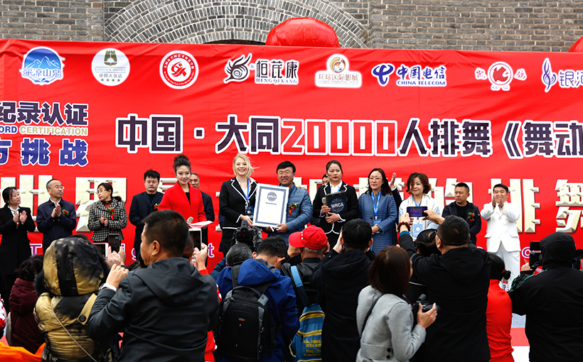 The Line Dance Association of Shanxi Province, Datong city, China organized an event "Dancing China: Ten thousand people dancing line dance". The World Record Certification Agents performed on-site authentication and verified the event as a new world record of the World's largest line dance.