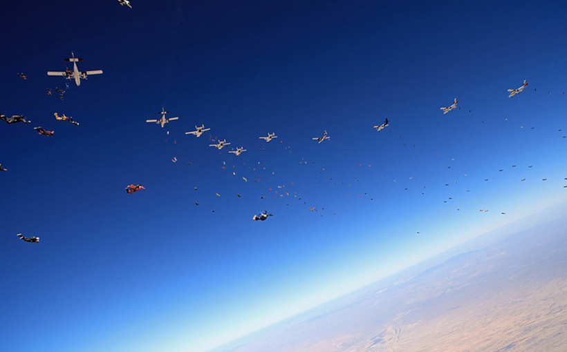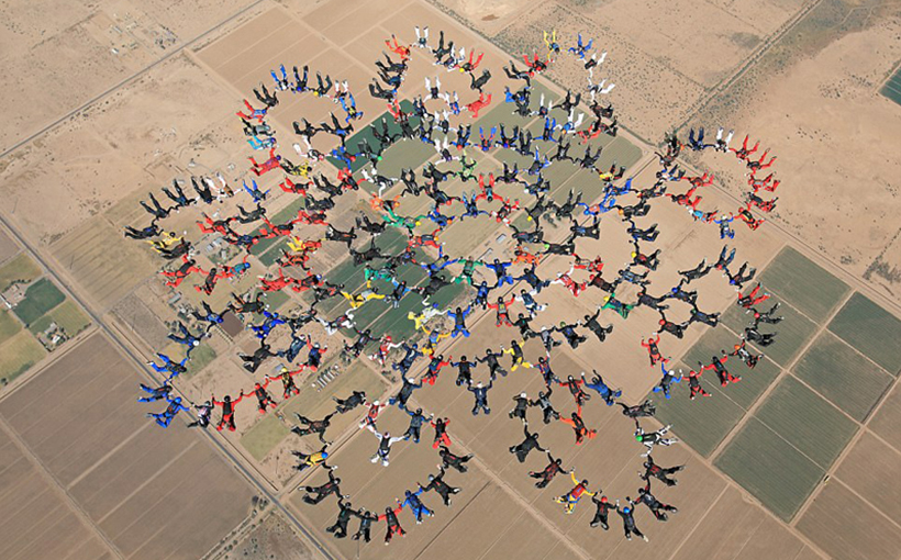 2017年11月,217名跳伞者在美国亚利桑那州埃洛伊(Eloy)19000英尺(约5100米)高空跳下后,以120英里(193千米)的时速冲向地面。经历几秒钟的自由落体后,他们调整位置,排好队形,在空中组成了对称的花形图案,经世界纪录认证(WRCA)确认,此次他们成功刷新了“最多人数自由落体时在空中形成图案”世界纪录。此前的纪录由104人保持。