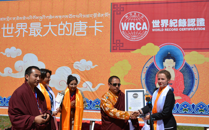 Yushu Culture Tourism and Communication Company Co. Ltd. funded manufacturing of a huge thangka, themed "Shakyamuni Buddha Padded Embroidery Thangka", which was finished in 2015 after 9 years of work. The World's Record Certification agent performed on-site measurements and certified the"Shakyamuni Buddha Padded Embroidery Thangka" the biggest thangka in the world.