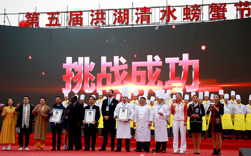 2018年11月10日,在中国湖北省洪湖市举办的"第五届洪湖清水螃蟹节"开幕式上,40名专业厨师共同制作了123道以螃蟹为原材料的菜肴,刷新了“菜品种类最多的全蟹宴”世界纪录。