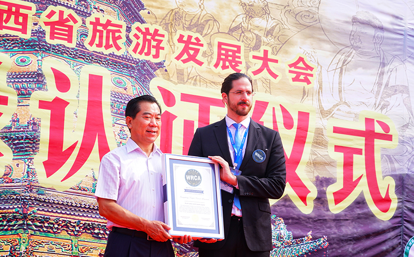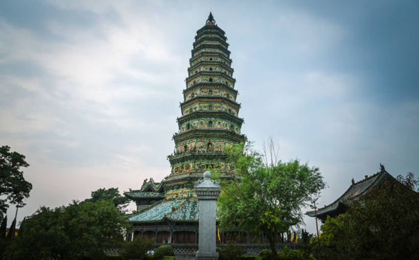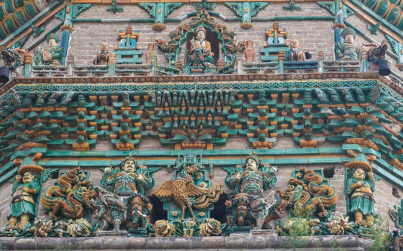 The Feihong Pagoda is situated in the Guangsheng Temple, Hongdong County, China. The tower is made of blue brick; exterior is inlaid with yellow, green, blue, purple and white glazed elements. The total height of the tower is 47.31 meters, with an octagonal ground plan, for a total of 13 layers. Certified by the World Record Certification Agency officials after an on-site measurement review, the tower was identified as the "world's tallest colorful glazed pagoda."