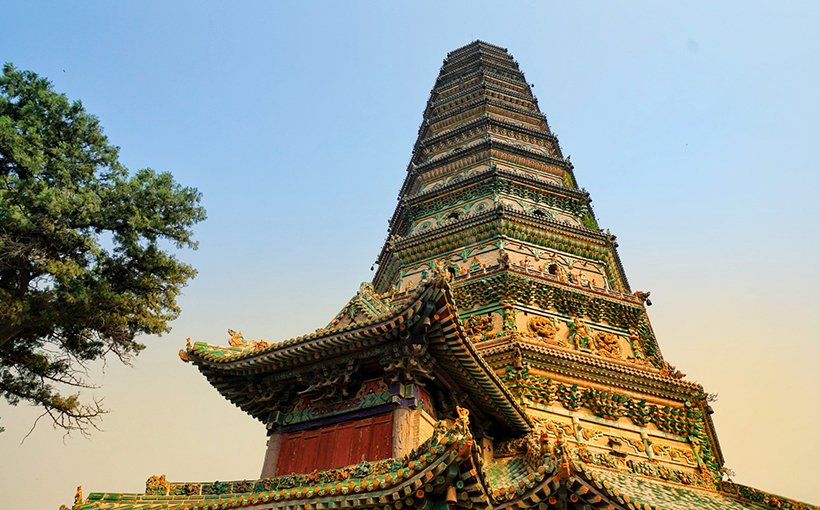飞虹塔始建于汉代,是中国现存最大最完整的一座琉璃塔。现塔为明武宗正德十一年(1516年)始建,嘉靖六年(1527年)完工,历时12年建成。塔平面八边形,是有十三檐的楼阁式佛塔。塔身外镶黄、绿、蓝、紫等多色琉璃烧制的屋宇、斗拱、莲瓣、角柱、栏杆、花罩及盘龙、人物、鸟兽和各种花卉图案装饰,金碧辉煌。因其塔身五彩斑斓如雨后彩虹,故名“飞虹塔”。