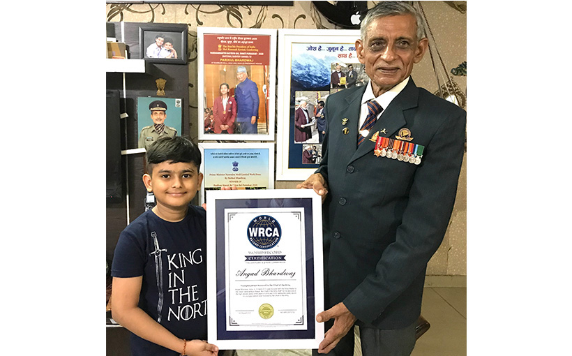 Angad Bhardwaj(印度,出生日期:2010年4月15日),2019年12月26日,被印度将军、陆军参谋长Bipin Rawat授予银牌,以表彰他在2018年和2019年在印度高原地区服务的成就。经世界纪录认证(WRCA)官方审核,Angad被确认为"受陆军元首表彰最年轻的人"。