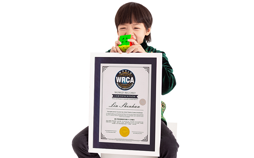 来自中国厦门市的林珅涵(出生日期:2014年4月21日)于2020年11月27日在南宁市连续盲拧还原2个二阶魔方,用时1分10.99秒。经世界纪录认证(WRCA)官方审核,林珅涵成功刷新“最小年龄连续盲拧还原2个二阶魔方”世界纪录。