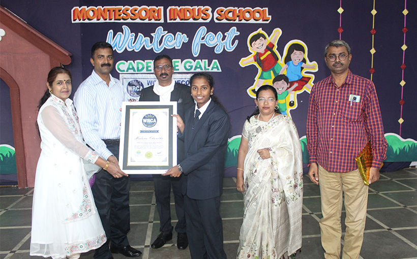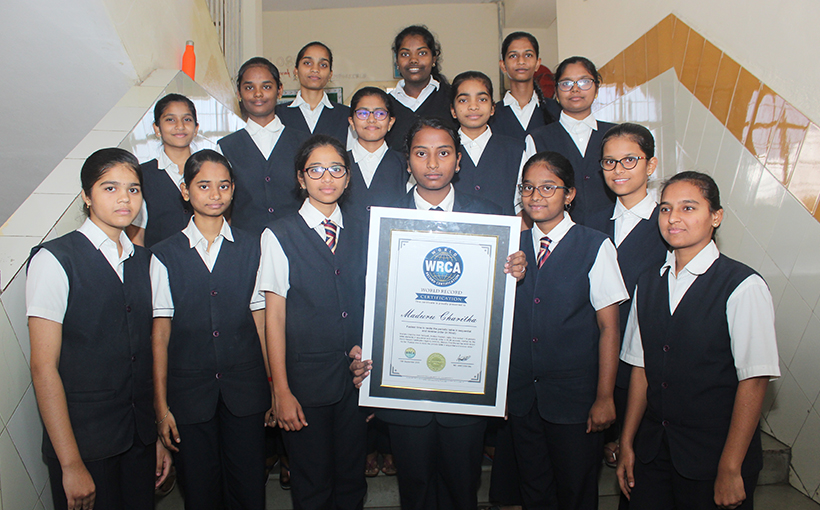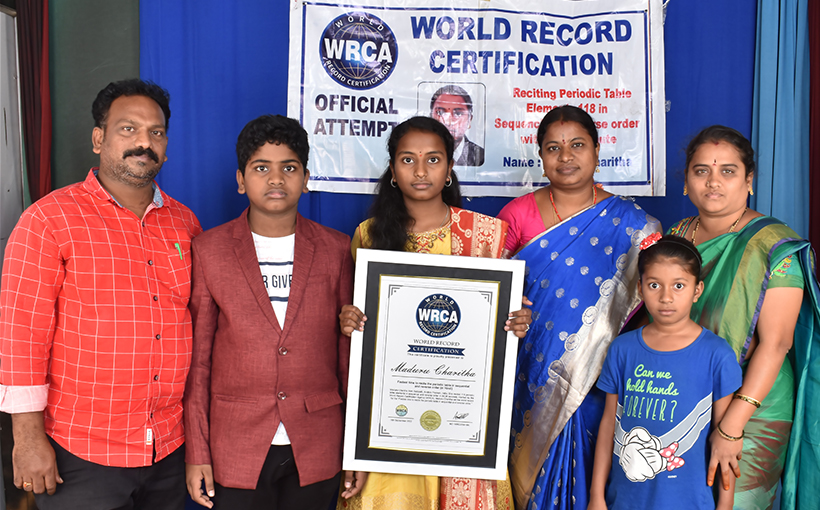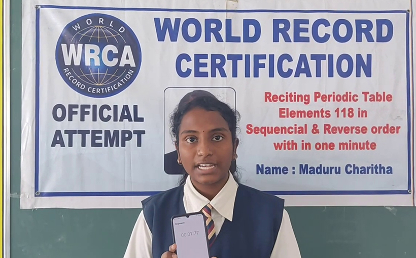 Maduru Charitha from Settipalli, Andhra Pradesh, India. She recited 118 periodic table elements in sequential and reverse order in 50.98 seconds. Verified by the World Record Certification Agency (WRCA), Maduru Charitha set the world record for the “Fastest time to recite the periodic table in sequential and reverse order.”