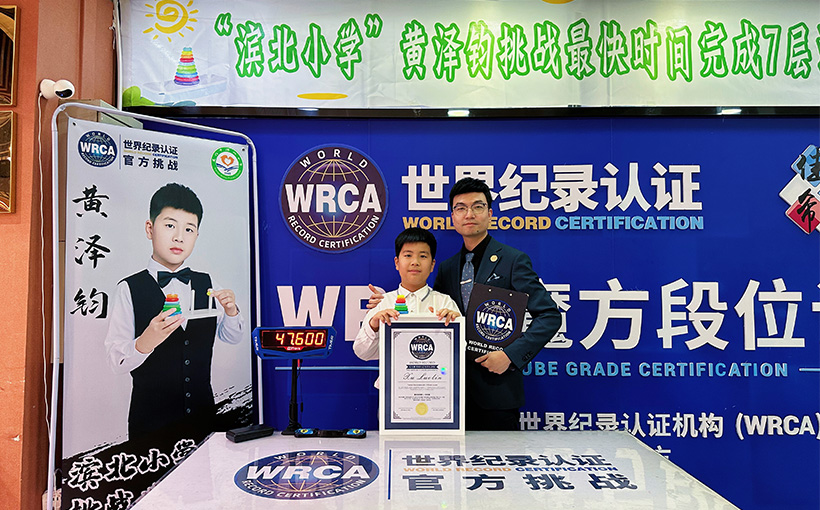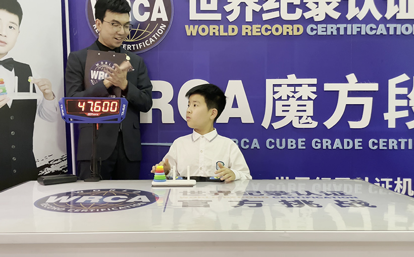 来自中国厦门市的黄泽钧于2023年4月19日在厦门市以单手成功完成7层汉诺塔,用时47.6秒。经世界纪录认证(WRCA)官方审核,黄泽钧成功打破“最快时间完成7层汉诺塔(单手)”世界纪录。纪录编号:WRC230130A