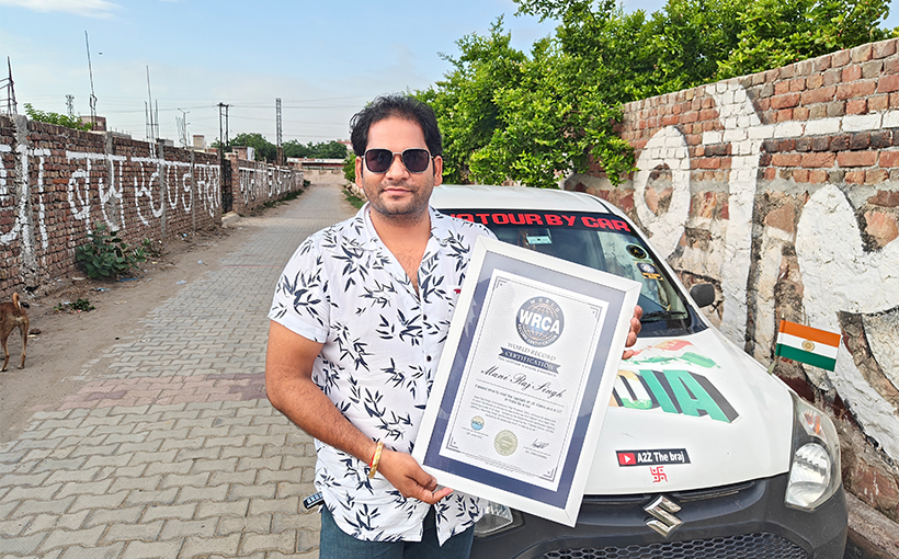 Mani Raj Singh, from Mathura, Uttar Pradesh, India, explored 28 states and 6 Union Territories by driving his Maruti Alto car from March 1st to April 11th, spanning a total of 42 days. Verified by the World Record Certification Agency (WRCA), Mani Raj Singh set the world record for the "Fastest time to visit the capitals of 28 states and 6 UT in India by a car".