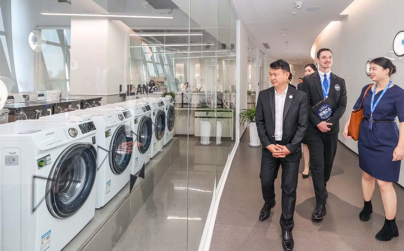利郎供应链上下不断攻克技术难题、寻求最优解决方案。“光是面料方面,就挑选了数百种。该款面料是利郎面料研究所自主研发专业耐洗面料,机洗不易变形褪色,舒适轻弹抗皱,面料一抚即平,机洗后无需熨烫即可自然平整,轻松做到30次机洗不易褪色不易变形。”