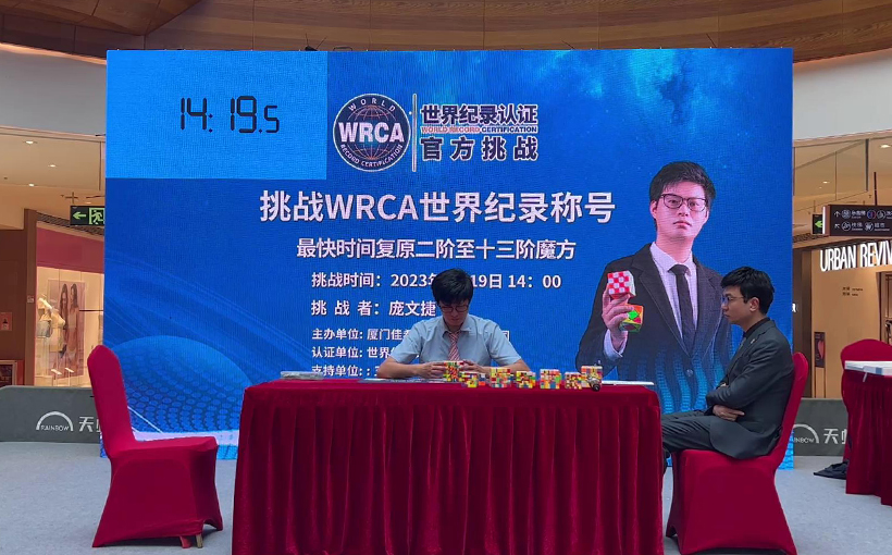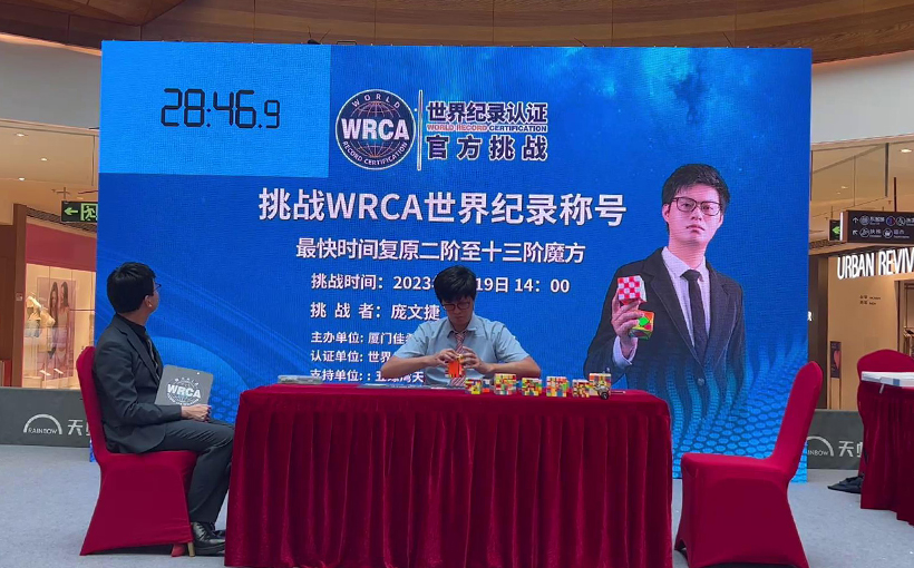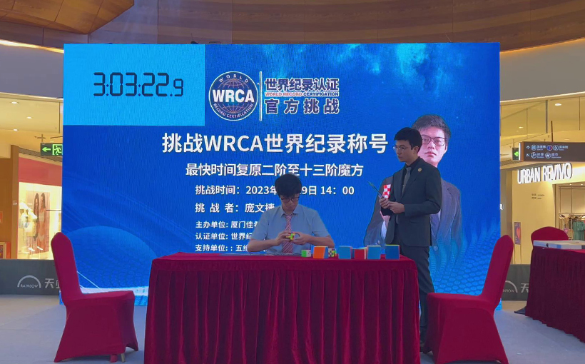 来自中国厦门市的庞文捷于2023年8月19日在厦门市成功还原二阶至十三阶魔方共12个魔方,用时3小时9分45.431秒。经世界纪录认证(WRCA)官方审核,庞文捷成功创造“最快时间还原二阶至十三阶魔方”世界纪录。纪录编号:WRC230428A