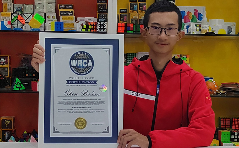 Chen Bohan (b. 5 October 2007) from Guangzhou City, Guangdong Province, China, successfully solved a 4×5 Klotski puzzle with one hand with the layout of "Hengdaolima" in 7.686 seconds in Guangzhou on 29 December 2024. Verified by the WRCA, Chen Bohan successfully broke the world record for the "Fastest Time to Solve a 4×5 Klotski Puzzle with One Hand".