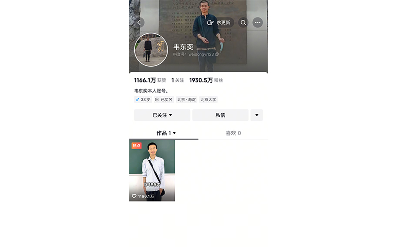 According to the official and authoritative release of the World Record Certification Agency (WRCA), as of 22:00 on June 7, 2025, the number of followers of Wei Dongyi's Douyin account has exceeded 19 million, and the number of video likes has exceeded 10 million. Verified by the World Record Certification Agency (WRCA) he has been confirmed as the "Most followers gained in the academic field on Douyin within 72 hours by an individual".
