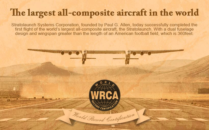 2019年4月13日 – 由Paul G. Allen创立的Stratolaunch系统公司今天成功完成了世界上最大的全复合材料飞机Stratolaunch的首次飞行。凭借双机身设计使得这架全球最大的复合材料飞机拥有最大的翼展——117米。这架飞机的出世成功地打破了修斯飞机公司——H-4“云杉鹅”所保持的97.54米的记录,最大翼展117米使其成为当今世界上最大的飞机。