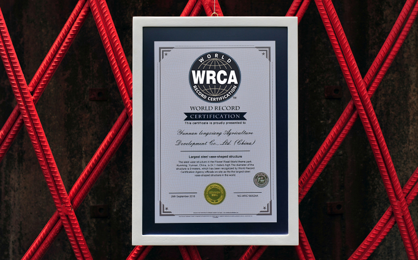 2018年9月29日,位于中国云南省昆明市花道人间主题公园内的一座钢结构花瓶建筑,高24.1米,瓶身最宽9米,瓶口直径6米。经WRCA世界纪录认证官方审核,该花瓶被认证为“世界上最大的钢结构花瓶”。