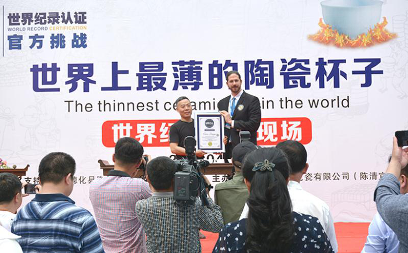 由德化县祥窑陶瓷研究所艺术总监陈清宜所研发的超薄《蝉羽杯》,其厚度仅为0.5mm,经世界纪录认证(WRCA)官方审核及现场严格缜密地认证、核实,最终认定《蝉羽杯》为“世界最薄的陶瓷杯子”。世界纪录认证仪式在中国泉州市德化县祥窑陶瓷研究所举行。