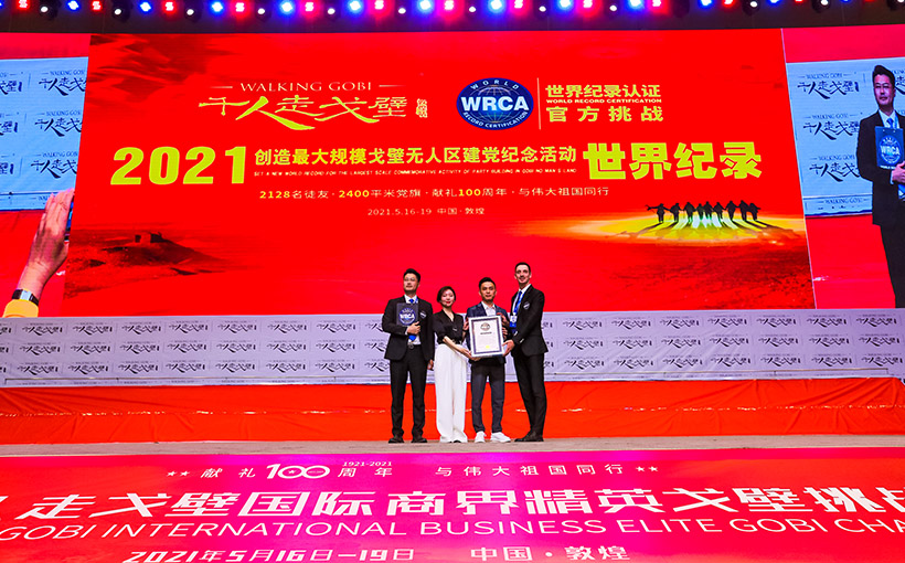 由上海企徒体育发展有限公司于2021年5月16日至5月19日在中国敦煌市组织的“第七届千人走戈壁国际商界精英戈壁挑战赛”活动中,共有2128名挑战者参与了中国共产党建党100周年纪念仪式。在仪式中由所有挑战者共同展开一面面积为2400平方米中国共产党党旗。2021年5月19日,经世界纪录认证(WRCA)官方审核,该活动成功创下“最大规模的戈壁无人区党建纪念活动”世界纪录。