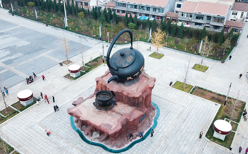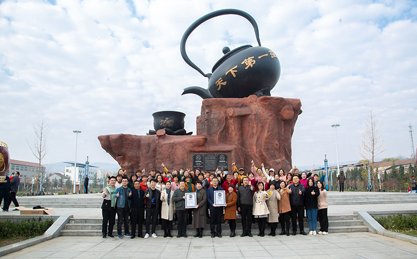 The cast iron teapot sculpture, which is located in Nancun Town, Jincheng, Shanxi, China, was produced one-time by traditional casting and fundrasing was organized by the local government. The sculpture has a height of 965 cm (including the teapot handle), a diameter of 703 cm, a wall thickness of 8 cm, a volume of 125.6 m and a weight of 134.5 T (including the teapot handle and teapot lid). Verified by the World Record Certification Agency (WRCA), it has been confirmed as "the world's largest cast iron teapot".