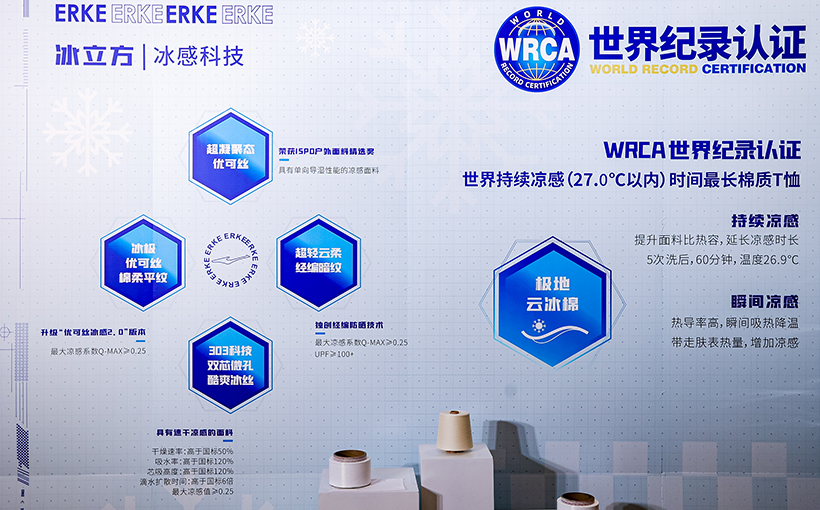 A cotton T-shirt designed and developed by Fujian Hongxing Erke Sports Goods Co., Ltd., in the sustained coolness performance test, after washed 5 times, and over the course of the next 60 minutes, the highest temperature it reached was 26.9℃. Verified by the WRCA, the T-shirt was confirmed as the "Longest lasting cotton T-shirt with sustained coolness (below 27℃)".