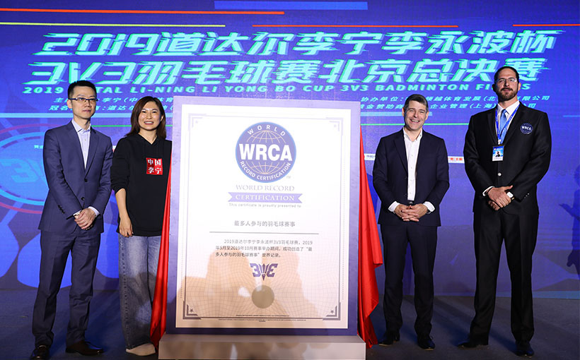 Organized by Li Ning (China) Sports Goods Co., Ltd. and sponsored by Total Lubricants China Co., Ltd., the 2019 Total Li-Ning Li Yong Bo Cup 3V3 Badminton Tournament was held from May to October 2019. 34,463 participants took part in the tournament. Verified on site by the World Record Certification Agency (WRCA), it has been confirmed as “the world's most-attended badminton tournament”.