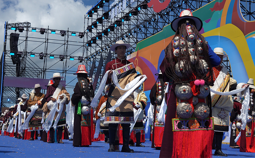 此次情歌对唱和服饰展演借助全省第九届藏族拉伊大赛暨海南州首届“青海湖杯”赛马会活动契机,多样化呈现安多藏族文化“活态传承”的当代实践。活动现场,200名歌手与群众身着盛装,以环形阵列演绎百年传承的“拉伊”(藏族情歌),在长者领唱下,男女声部错落呼应、声浪如潮,生动诠释了藏族情歌作为“口头非物质文化遗产”的鲜活生命力。