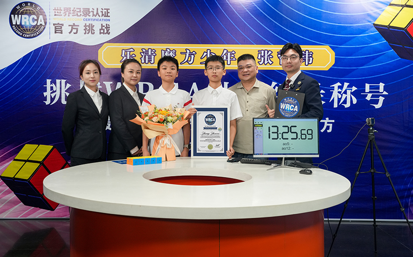 来自中国浙江省乐清市的张哲玮于2025年6月1日在乐清市连续盲拧还原10个二阶魔方 ,用时13分25.69秒 。经世界纪录认证(WRCA)官方审核,张哲玮成功打破“最快时间盲拧还原十个二阶魔方”世界纪录。纪录编号:WRC250423C