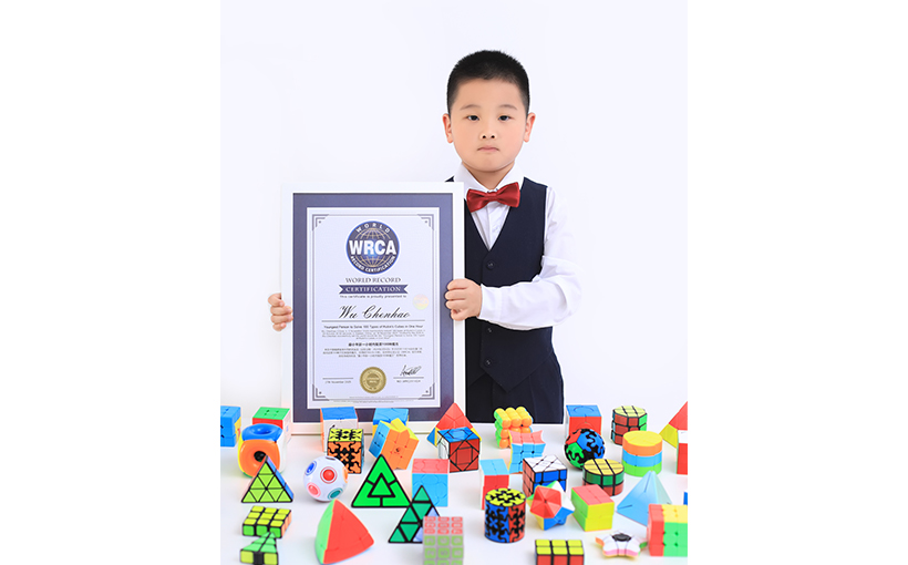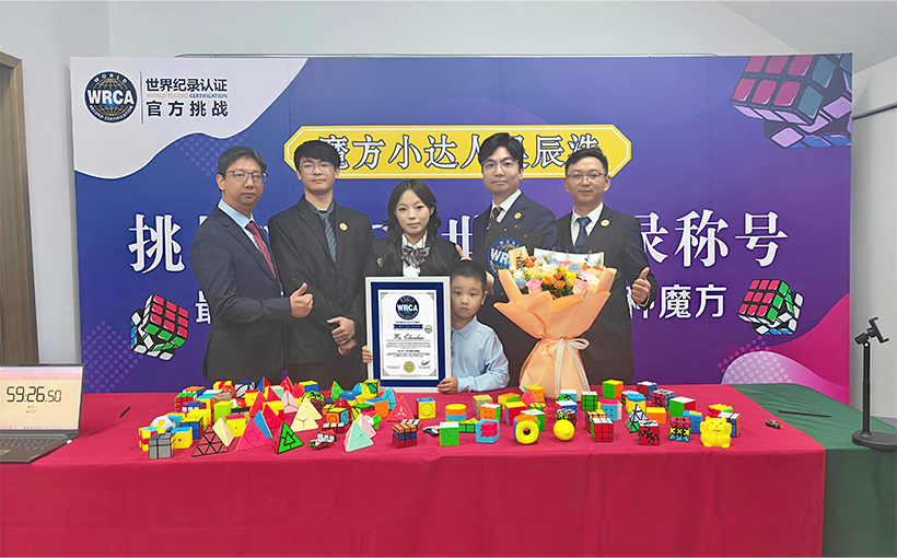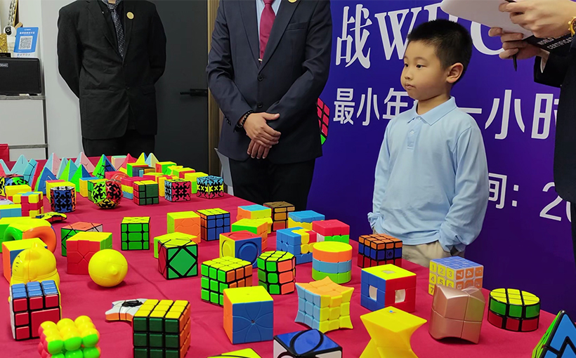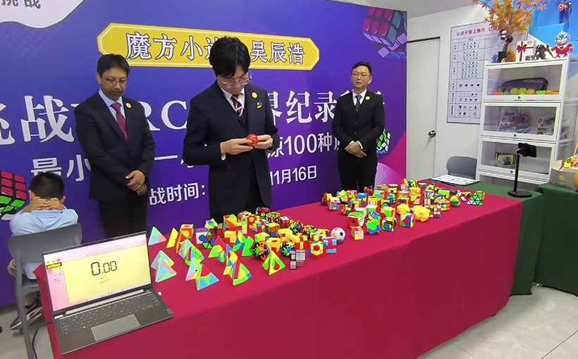来自中国福建省泉州市的吴辰浩(出生日期:2020年2月6日)于2025年11月16日在厦门市成功还原100种不同类型的魔方,总用时59分26.50秒。经世界纪录认证(WRCA)官方审核,吴辰浩成功创造“最小年龄一小时内复原100种魔方”世界纪录。纪录编号:WRC251102A