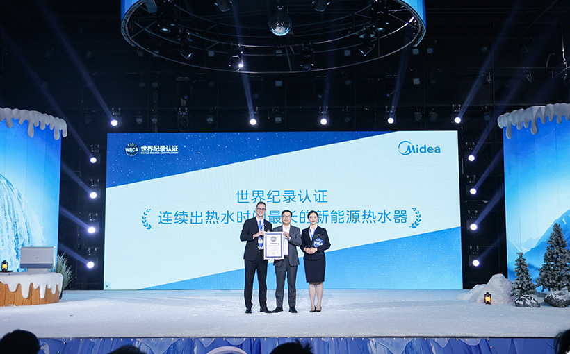 由美的集团设计研发的美的超导新能源热水器,在出水性能测试中,首次储热停止后,于不断电情况下连续不间断输出(40±2)℃热水时长为400分钟。经世界纪录认证(WRCA)官方审核,美的集团首创“连续出热水时间最长的新能源热水器”世界纪录。纪录编号:WRC251208A
